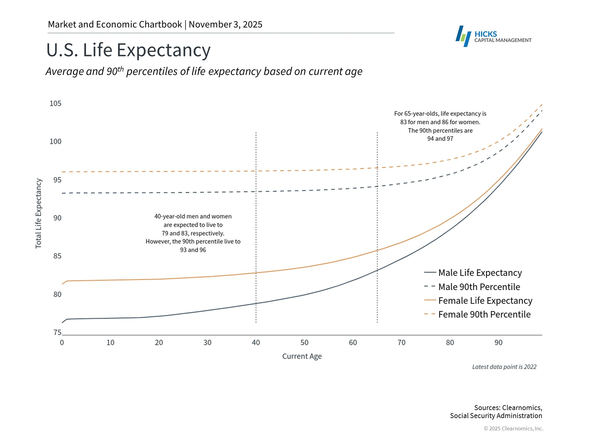 Just as gains can compound over time, so do losses if the purchasing power of a portfolio does not keep up with inflation. This is even more important today since retirees must also plan for the possibility of living longer than previous generations. This means that life expectancy is an important input to any financial plan.According to the latest Social Security Administration data, 40-year-old men and women have an average life expectancy of 79 and 83, respectively. However, for those who make it to 65 years of age, their life expectancies increase to 83 and 86. These are just averages - those in the 90th percentile could live to 94 and 97, respectively.While the opportunity to enjoy a longer, healthier retirement is a wonderful development over the past century, the difference between a 20-year retirement and a 30-year or longer retirement has dramatic implications for portfolio construction and withdrawal strategies. This is sometimes known as “longevity risk,” a challenge that is asymmetric since running out of money during retirement is far more problematic than leaving assets to loved ones or charitable causes.So, while many prioritize income-generating investments like bonds when it comes to retirement planning, it’s also important to maintain growth-oriented assets like stocks. It also creates financial challenges that make thoughtful planning even more valuable. Understanding how to structure portfolios for multi-decade retirement periods, while managing withdrawal rates and adapting to changing market conditions requires expertise that goes well beyond simple rules of thumb.