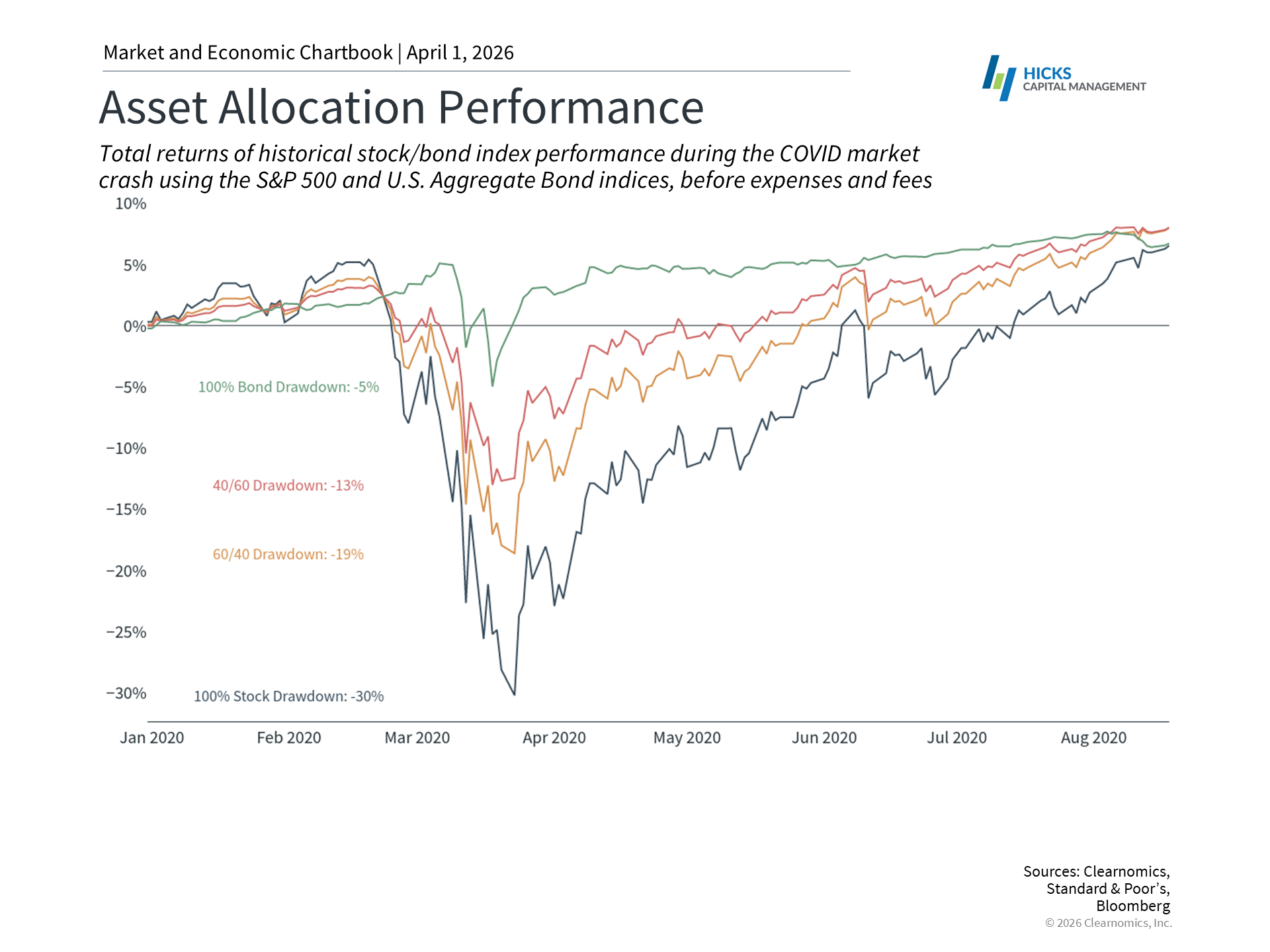 While there are considerations across each asset class, the past few weeks highlight the power of properly constructed portfolios. Holding different types of investments, whether they are asset classes, specific sectors, or investing across different parts of the world, helps to smooth out portfolio performance during choppy periods, reducing the temptation to make sudden changes that can derail financial plans. The accompanying chart highlights one of the most volatile periods in history during the pandemic in 2020. Different asset allocations behaved in unique ways, with those that were more balanced across asset classes experiencing smaller swings. While these portfolios all ended around the same level after this period, the real issue is whether investors would have overreacted when the stock market was down 20% or 30%. Today, assets like commodities are leading the way due to energy and precious metals. However, this is not about trying to guess which asset class will outperform next and concentrating a portfolio in that area. Instead, it is about benefiting from the full range of market movements. When one part of a portfolio struggles, another may provide balance. Over time, this approach has allowed investors to participate in growth while managing risk, which is ultimately what achieving long-term financial goals requires. The bottom line? Market volatility driven by oil prices and geopolitical uncertainty is uncomfortable but not unusual. Staying invested with a diversified portfolio remains the best way to turn short-term swings into long-term progress. | |||