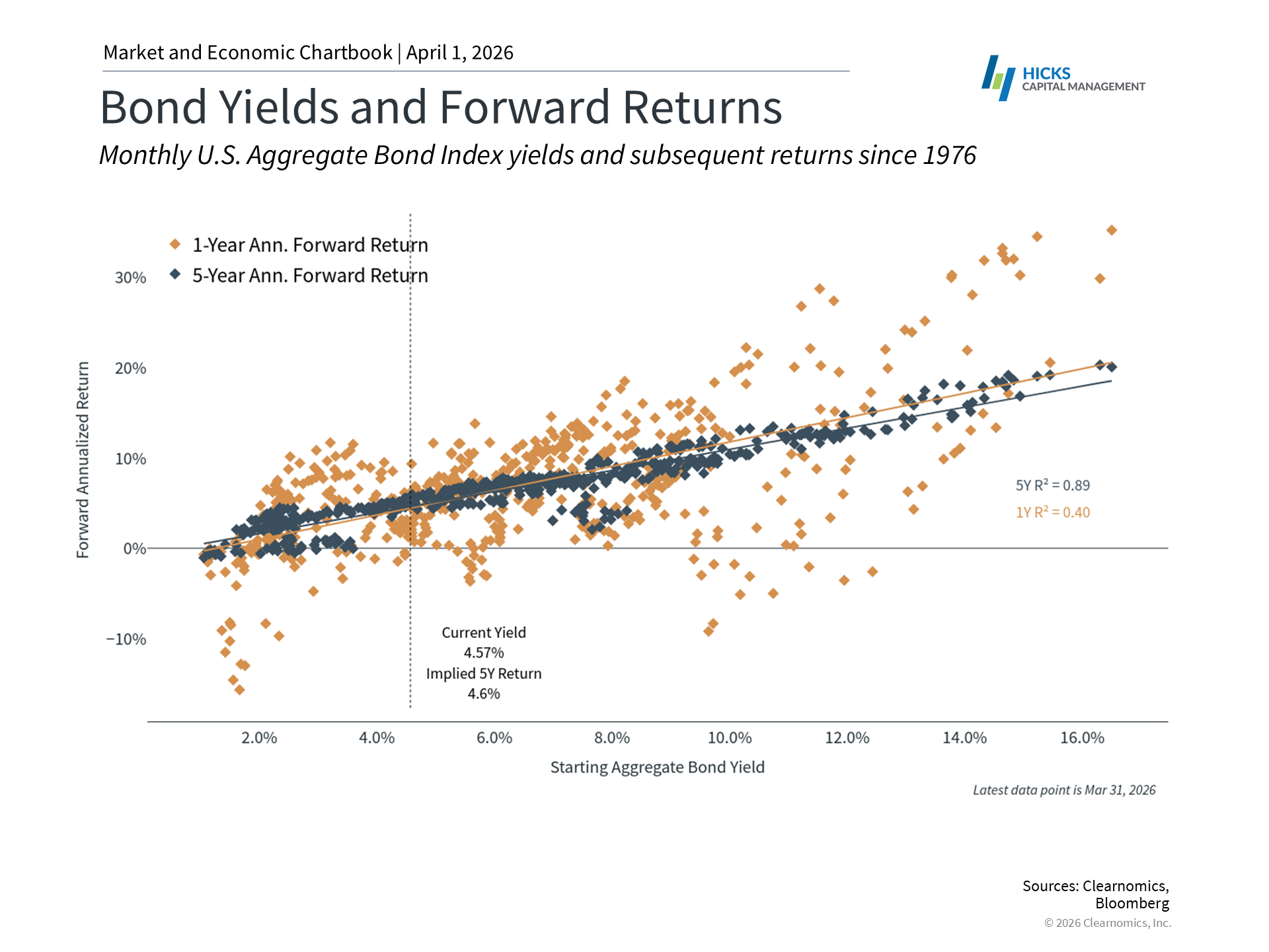 While the stock market gets most of the headlines, the bond market is just as important. The possibility of inflation is one of the key drivers of bonds, and higher oil prices have raised new questions in recent weeks. Adding to the uncertainty is the upcoming transition to a new Fed chair in May and questions about whether the central bank may adjust its rate path. At the moment, market-based measures expect only one rate cut by the end of this year. Bonds are a core holding that often provide a counterbalance against stock market volatility. However, the conflict in the Middle East has also affected bonds, with the Bloomberg U.S. Aggregate Bond Index roughly flat year-to-date. The 10-year U.S. Treasury yield has jumped back above 4.2% after falling as low as 3.9% when the conflict in Iran began. Perspective is needed since bonds have contributed positively after their historic pullback in 2022, when inflation and interest rates rose swiftly, generating strong returns from 2023 to 2025. Since the bottom in October 2022, the broad bond market has generated roughly 20% in total returns, with some individual sectors performing even better. For long-term investors, bond yields remain attractive compared to the previous decade. Current bond yields offer meaningful income potential that was simply unavailable during much of the past decade. Specifically, the yield on the U.S. Aggregate Bond Index is 4.5%, well above the 2.9% average since 2009. Investing when yields are attractive is also historically correlated with healthy total returns, as shown in the accompanying chart. This is especially true when compared to cash, where yields are still negative after adjusting for inflation. On average, $10,000 invested in certificates of deposit yields about $155 a year, which is still well below inflation of between 2.5% to 3%. For those in or near retirement, the applicable inflation rates may be even higher due to medical expenses and insurance. So, while cash may feel safe, a proper allocation to bonds is still the best way to generate income and support long-run growth. It is also worth noting that there is growing concern around private credit, with reports of rising redemption requests and some larger funds limiting withdrawals. At its core, private credit is an asset class consisting of non-bank loans to companies. The sector has grown significantly in recent years and is tied to areas of market uncertainty such as technology and energy. Unlike public bonds, private credit is structured to be a long-term investment precisely because of this type of uncertainty. So, just like any other asset class, what matters for investors who hold private credit is whether it is appropriate for their portfolios and how it balances with other assets. Having a portfolio perspective continues to benefit investors