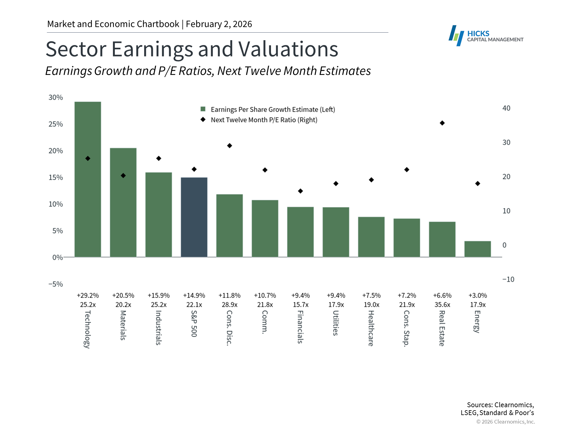 For investors, this trend has multiple implications. Companies making these investments, often called “hyperscalers” due to their massive computing infrastructure, are betting on continued growth in AI adoption. If these bets pay off through increased demand for AI services and applications, the investments could drive substantial earnings growth for years to come. However, if adoption disappoints or takes longer than expected, companies may face pressure on profit margins and returns on invested capital. The chart above shows that earnings growth expectations vary across sectors, with the highest earnings growth expectations in the Information Technology sector.