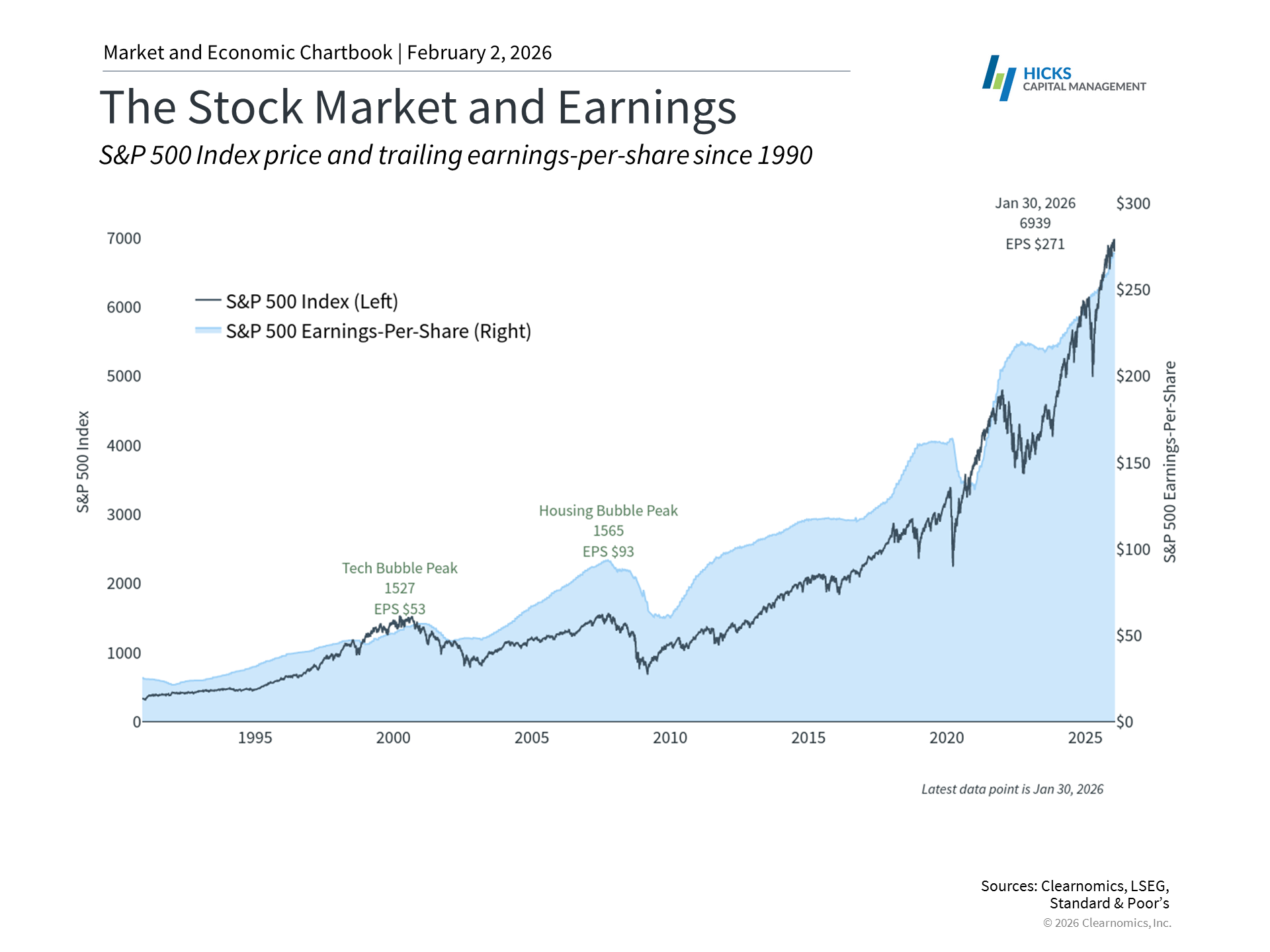 Corporate earnings are what connect the stock market to the economy, and ultimately to portfolios. When economists analyze GDP growth, the job market, or consumer spending, these factors affect investors through their impact on corporate profits. This is because a healthy economy usually leads to improved sales and earnings for companies, just as we have experienced over the past few years. Since owning stock entitles investors to a share of a company's profits, share prices tend to appreciate when earnings grow.